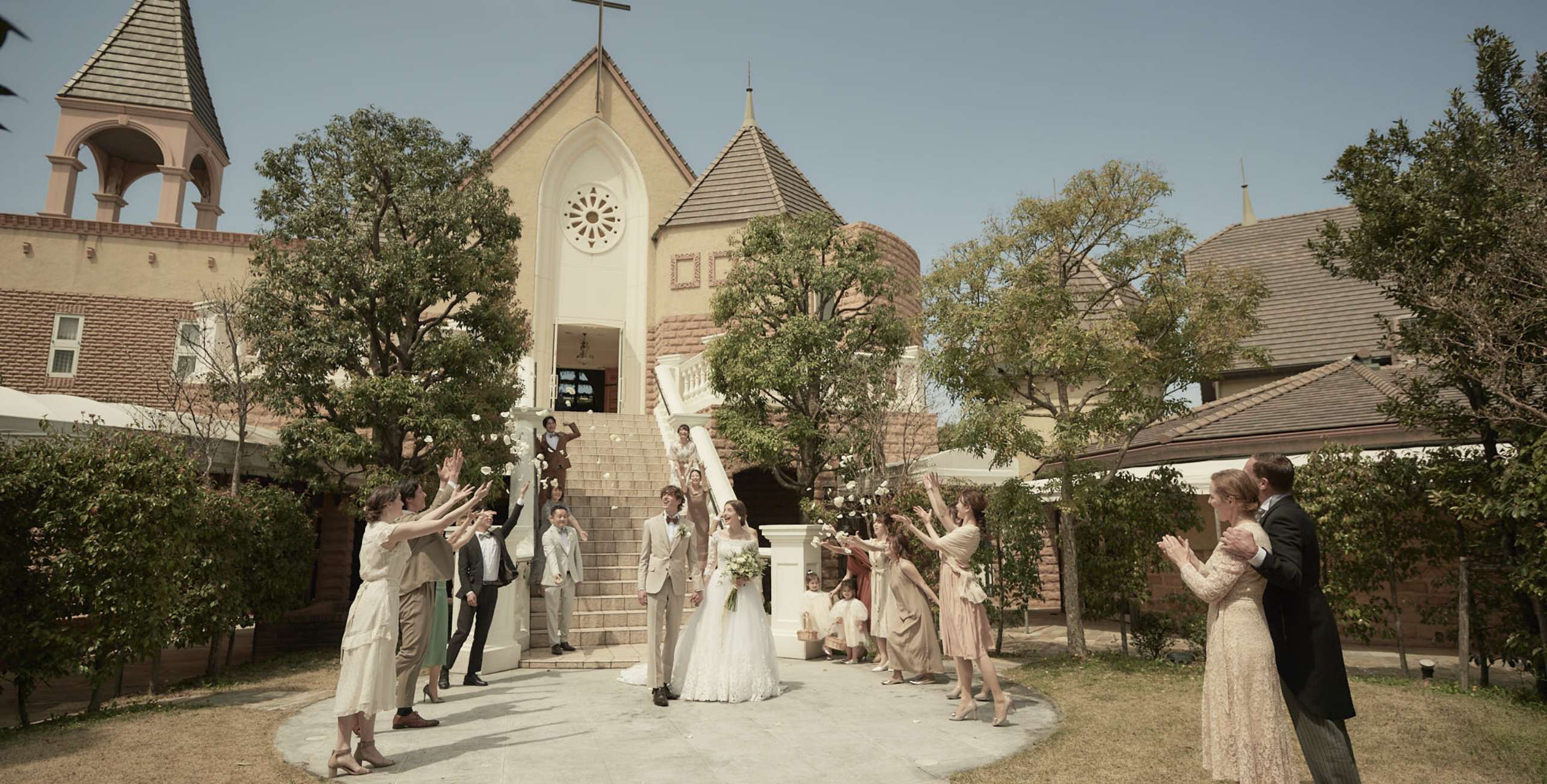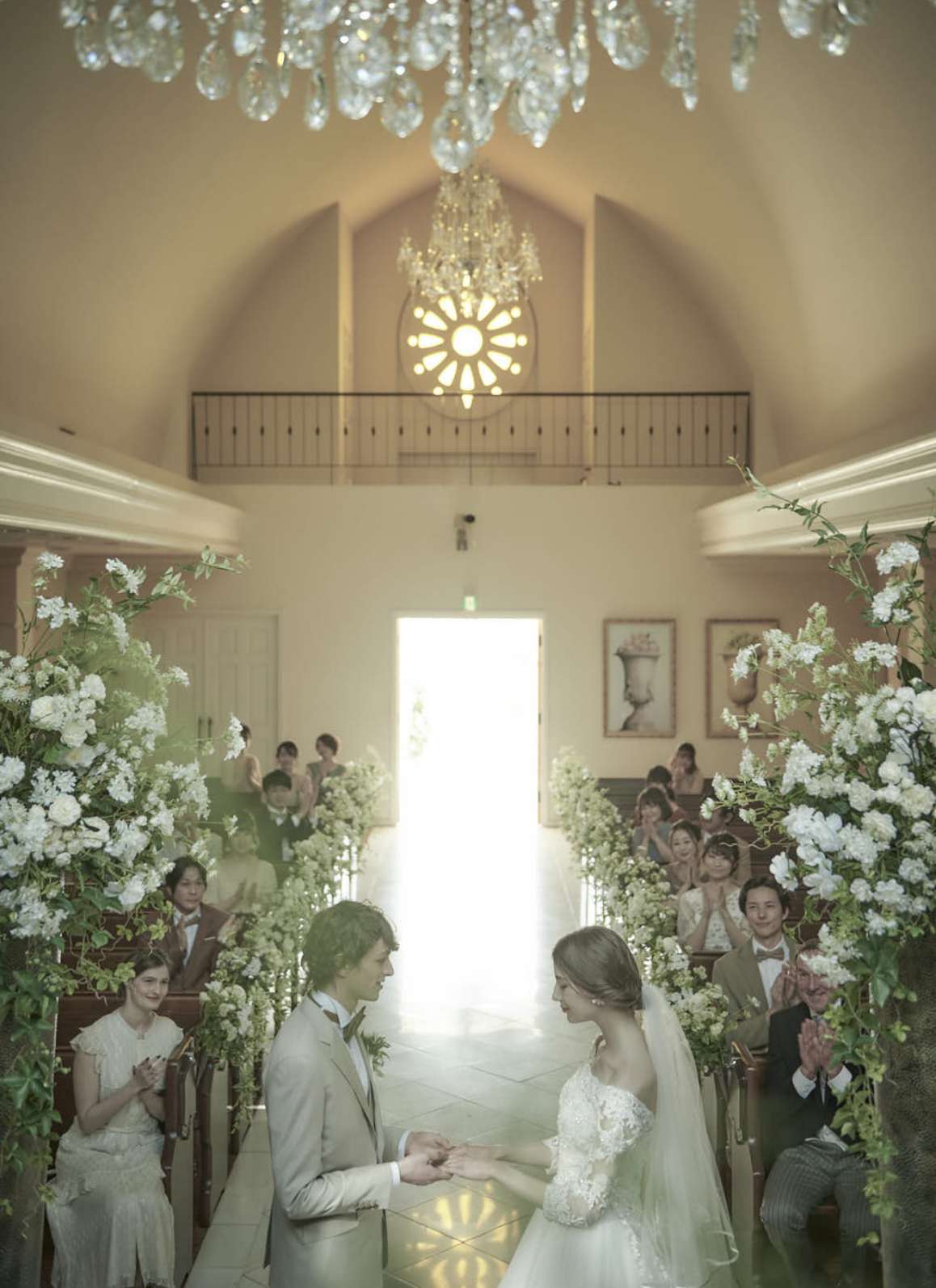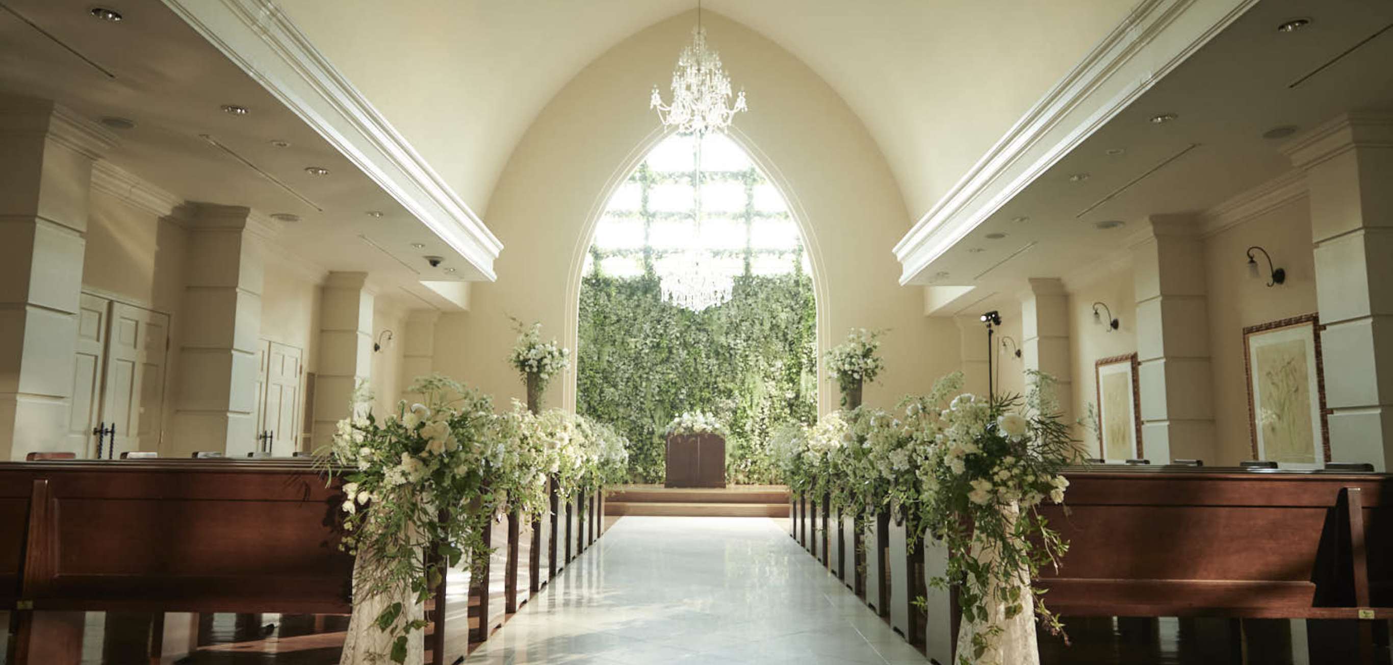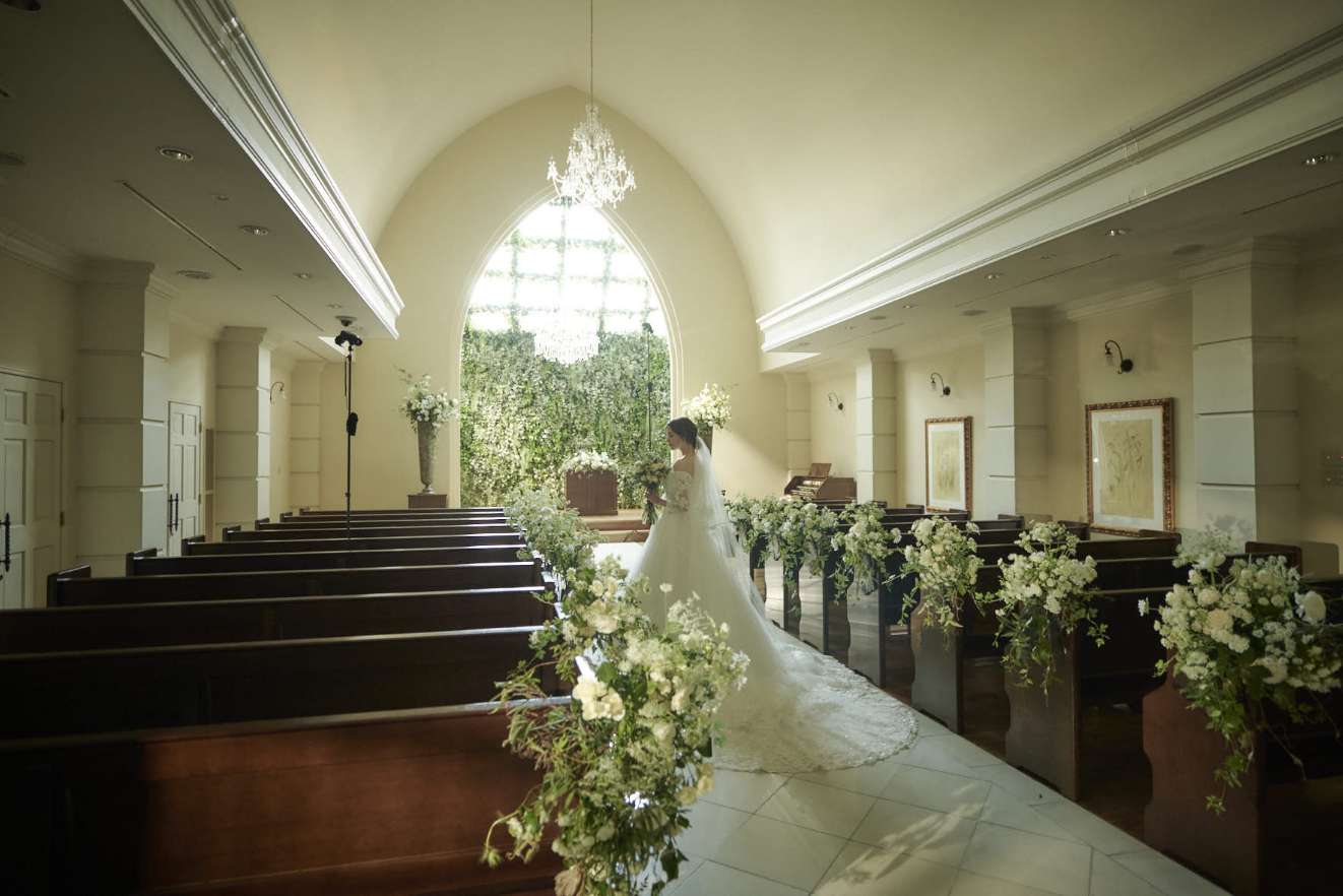 重厚な扉を開くと、厳かさとぬくもりに満ちた神聖な空間が広がる「チャペル・ド・ソレイユ」。17mもの大理石のバージンロードを一歩一歩ゆっくりと進み、豊かな緑に彩られた祭壇へ。まばゆいほどの太陽の光の中で、永遠の誓いを交わすふたり。見守る家族とゲストも、あたたかな愛情と喜びの輪に包まれる瞬間です。