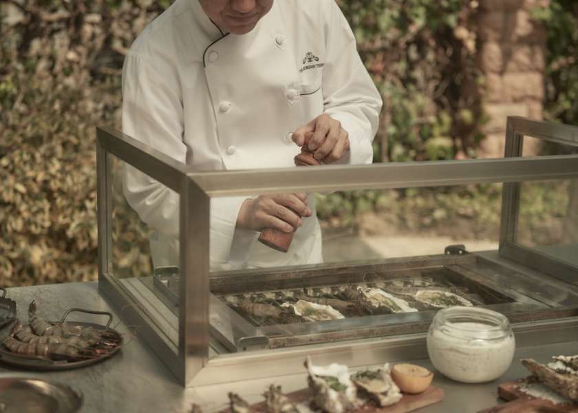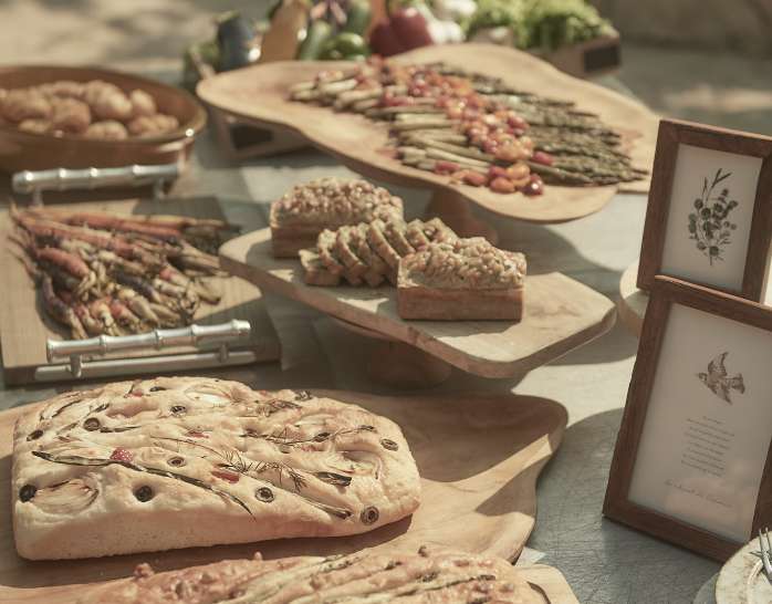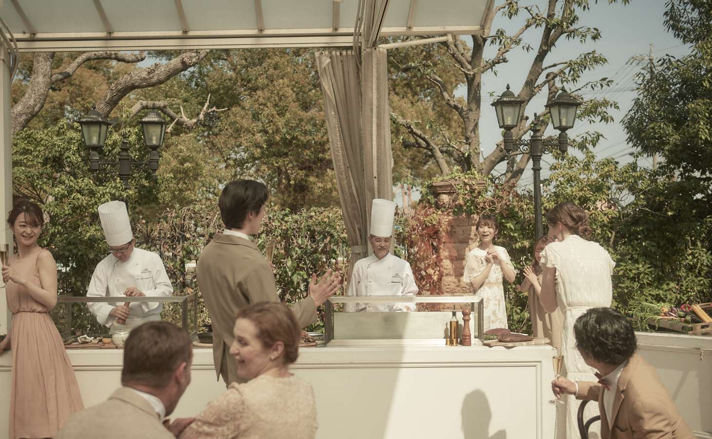 ガーデンにずらりと並んだ海の幸や山の幸、季節野菜を、新鮮なままシェフが目の前で調理するマルシェ・ダイニング。炎のあがるフランベ演出をきっかけに、料理が奏でる香ばしい香りや音。五感をたのしませてくれるパーティシーンに、ゲストの食欲も高まります。