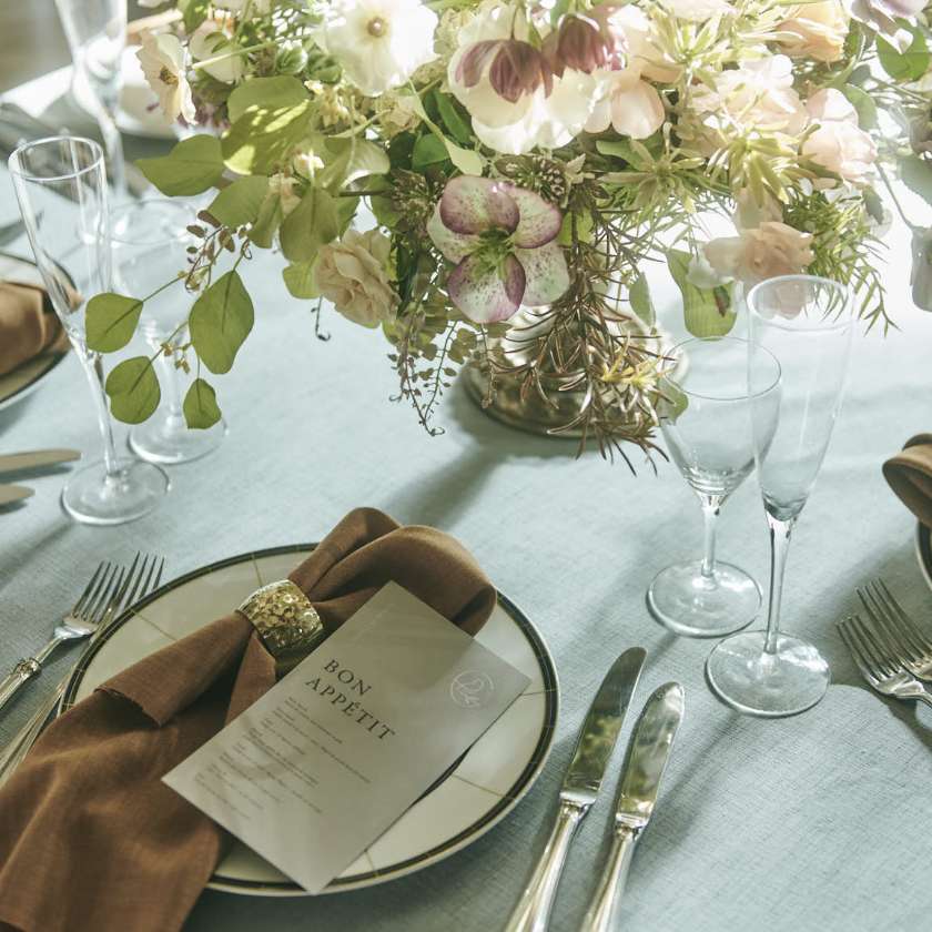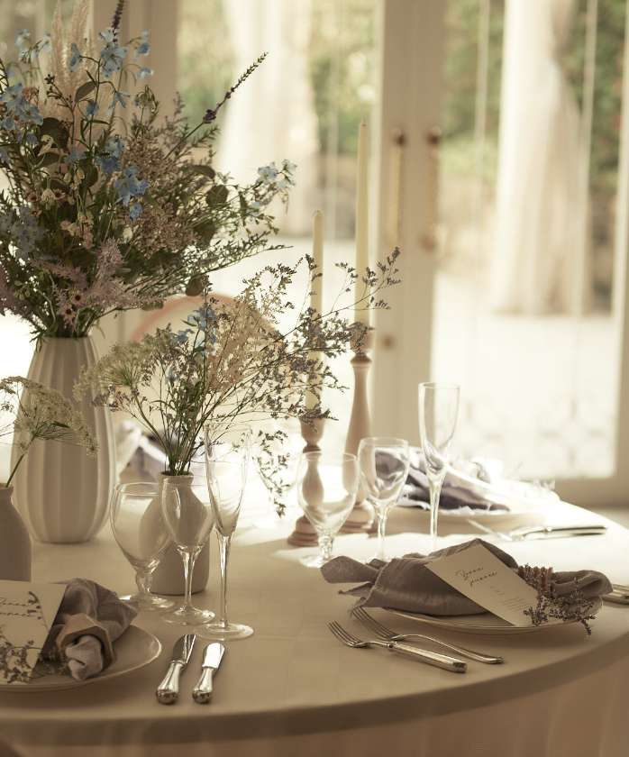パーティの雰囲気を決める会場コーディネートは、家具やインテリア、テーブルクロス、フラワー、小物など、各分野のプロフェッショナルが集結してプロデュース。最新トレンドを取り入れ、多彩に揃う会場にマッチするように揃えられたアイテムと高度なスタイリング力という強みをいかして、ふたりが思い描く理想のウェディングを形にします。